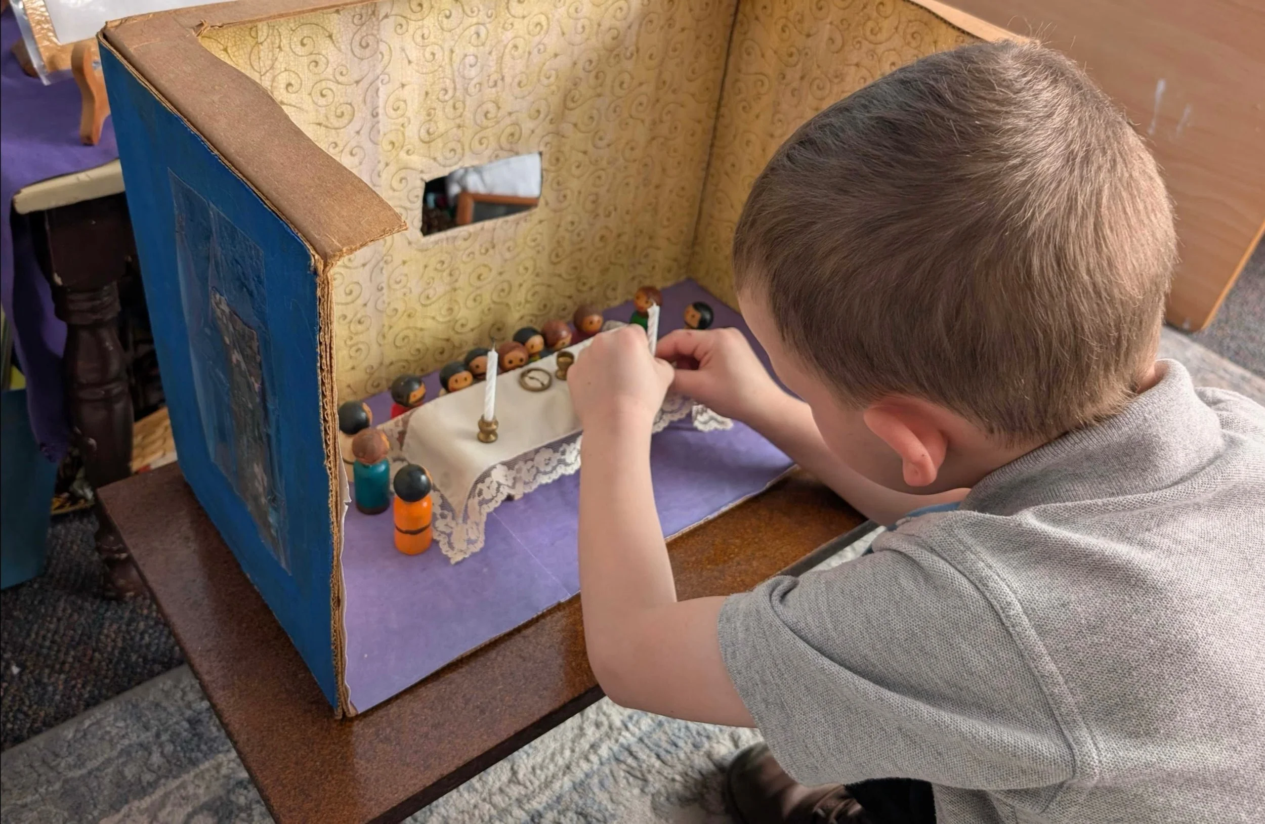 In Catechesis of the Good Shepherd, Level 1 and Level 2 children meditated with the models of the City of Jerusalem and the Cenacle (Last Supper) during the final weeks of Lent. Pictured below is a Level 1 child with the Level 1 Cenacle (Upper Room) materials.